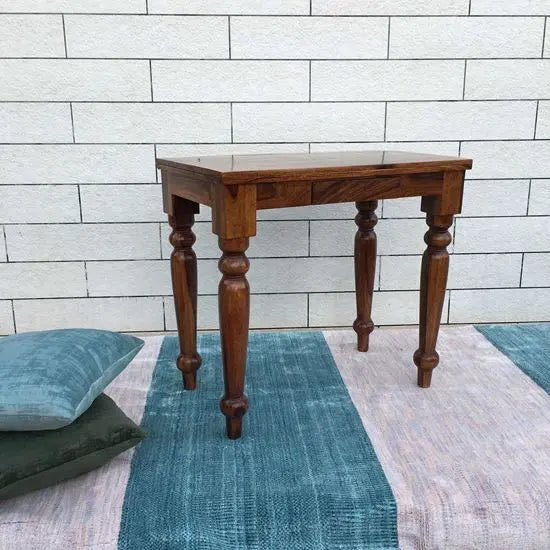 The Lazer Study Table, with its compact size and turned round legs, is the perfect addition to any space. Made from high-quality Sheesham wood, it features a convenient drawer for storage. This study table combines function with style, ideal for students and professionals alike. Assembly is easy and DIY.