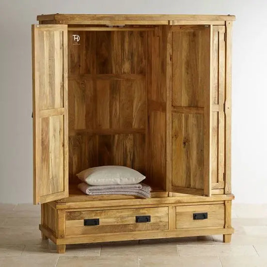 Rustic furniture under Devi collection is made from mango wood; this collection is finished with a natural mango finish. This collection includes a wall rack, single bed, double bed, mirror, almira, wardrobe two-door and three-door, bookcase, crockery almira, sideboard, cabinet, TV cabinet, etc. Mdf is used in bottom of drawers and back of cabinet.