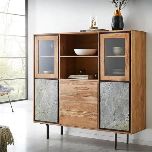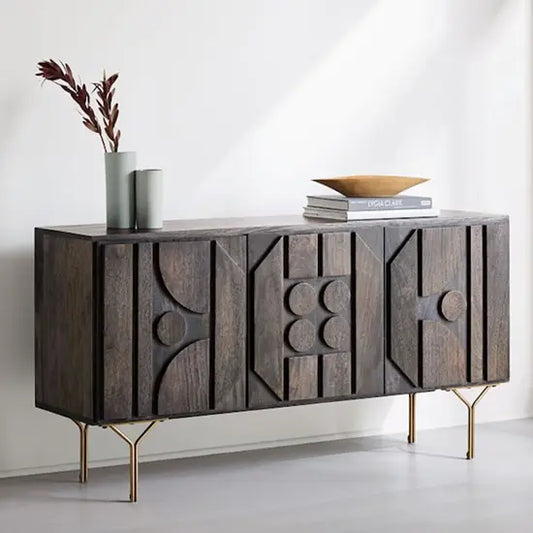 A Wooden sideboard typically refers to a piece of furniture designed for storage and display, often found in dining rooms or living rooms. It usually consists of cabinets, drawers, and shelves, providing ample space for storing diningware, linens, or other items. Sideboards come in various styles, ranging from traditional to modern, and can add both functionality and aesthetic appeal to a room. Our wooden sideboard cabinets are made from Sheesham wood, mango wood, and acacia wood.