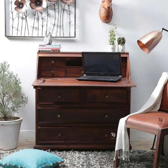 The Nona Dune Desk offers a spacious and stylish solution for your home office. Crafted from Sheesham wood with a honey finish, this desk features nine drawers for all your storage needs. The cabinet cum storage design also includes MDF at the back and bottom of drawers. Stay organized and productive with this functional and elegant desk. No assembly is required. You can also call it an extension study desk for children.